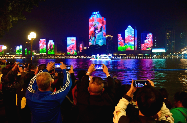 珠江两岸共40公里岸线景观优化后,市民争相到珠江边欣赏并拍摄美丽的灯画幕墙。广州日报全媒体记者王燕 摄
