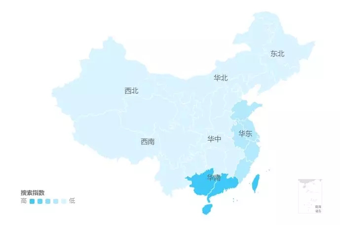 从“广东旅游”第一季度搜索指数图可以看出,广东第一季度搜索集中在春节前后,之后变化幅度较为平缓。可见春节假期对第一季度的旅游贡献力度相当大。从搜索的人群分布看,来自华南、台湾、华东的游客对广东旅游关注度更为集中。