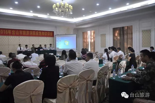 为全面提升台山市旅游企业生产安全意识、消防安全意识及应急处置能力,认真贯彻执行“安全第一、预防为主、综合治理”的安全生产方针,10月31日,台山市旅游局联合市公安消防大队、市安全监督管理局于台山碧桂园凤凰酒店开展了2016年消防安全知识讲座及应急演练,台山市有住宿设施的旅游景区、星级酒店和规模酒店等20家旅游企业参加了此次活动。