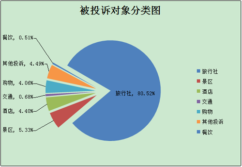从被投诉对象来分析,对旅行社的投诉仍是重点。在线旅行社投诉上升。数据显示,第三季度,投诉旅行社951宗,占受理投诉总数的80.52%,其中线下旅游投诉818宗,在线旅游投诉133宗。投诉景点63宗,占投诉总数的5.33%,投诉酒店52宗,占投诉总数4.40%,投诉购物48宗,占投诉总数4.06%,投诉交通8宗,占投诉总数0.68%,投诉餐饮6宗,占投诉总数0.51%,其它投诉53宗,占投诉总数4.49%。