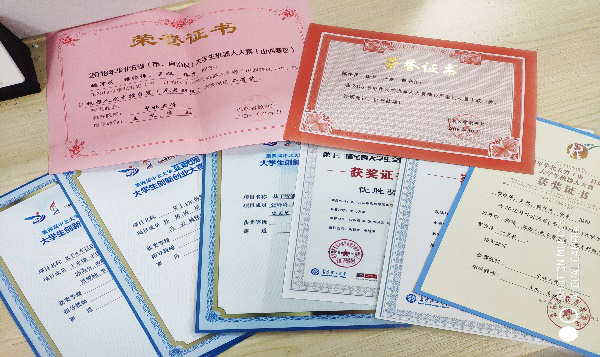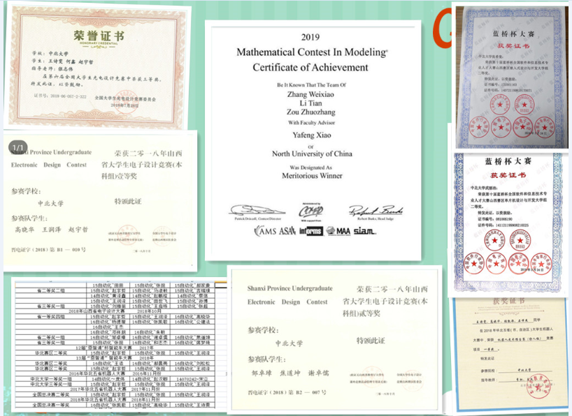 电子设计创新实验室目前在校人数60人,16级18人,17级22人,18级20人,面向全校学生纳新。实验室现主要参加的比赛有:美国大学生数学建模竞赛、华北五省机器人大赛、全国大学生数学建模大赛、蓝桥杯、山西省电子科技大赛、全国大学生电子设计竞赛、互联网+、大学生创新创业训练项目、挑战杯等。实验室成立以来获得国家级奖项25人,省级63人,图9-10为电子创新实验室所获奖项部分证书及作品。