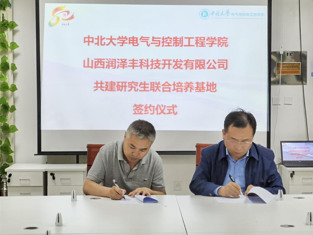 科研院长任一峰教授与山西润泽丰科技股份有限公司范文龙总经理代表双方签订了共建研究生联合培养基地协议书。