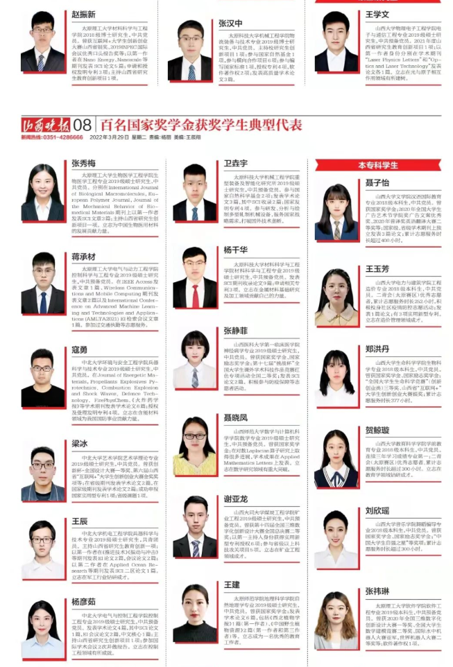 经过严格选拔与评审,山西共有2310名学生荣获2020-2021学年度国家奖学金,其中,博士研究生92名;硕士研究生601名;本专科生1120名;中职学生497名。为充分展现优秀学子的精神风貌,发挥国家奖学金的育人导向功能,特遴选出山西省2020-2021学年度100名国家奖学金获奖学生典型代表,展示他们的突出事迹。