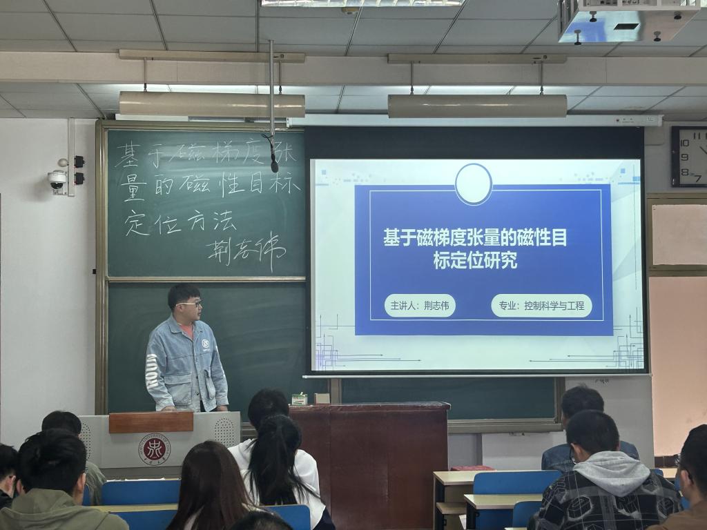 荆志伟同学首先介绍了磁性目标定位的现有技术,列举了五种目前广泛采用的磁性目标定位技术,并讲解了各自的特点与缺点;其次,关于磁梯度张量的磁性目标定位方法,荆志伟同学给大家讲解了磁梯度张度、磁偶极子模型、磁偶极子模型方程等相关知识,从环境磁场研究、构建新型传感器阵列并校准、仿真分析和试验验证四个过程介绍了研究的总体思路。最后,荆志伟同学根据自己发表多篇核心论文的经验向同学们分享了核心论文书写流程,鼓励大家努力学习,刻苦钻研,这样在未来的生活工作中才能拥有更多主动权。
