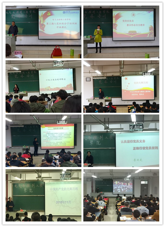 党委副书记杜苇、机械工程学院党委书记张清、信息与通信工程学院党委书记曹凤才、学生工作部(处)部(处)长尹建平分别进行《党的宗旨及意识形态安全教育》、《党的十九大精神辅导》、《党的光辉历程》、《党的指导思想》专题授课。第二天的培训课程由能源动力工程学院党委书记李运芝、软件学院党委书记段义权分别进行《党员的权利和义务》、《党的光荣历史》专题授课,同时还通过学习百家讲坛系列特别节目《平“语”近人——习近平总书记用典》、组织讨论等形式进行。为期两天的院党课培训让全体学员提高了党性修养和理论水平,不忘初心,牢记使命,为实现中华民族伟大复兴的中国梦不懈奋斗!