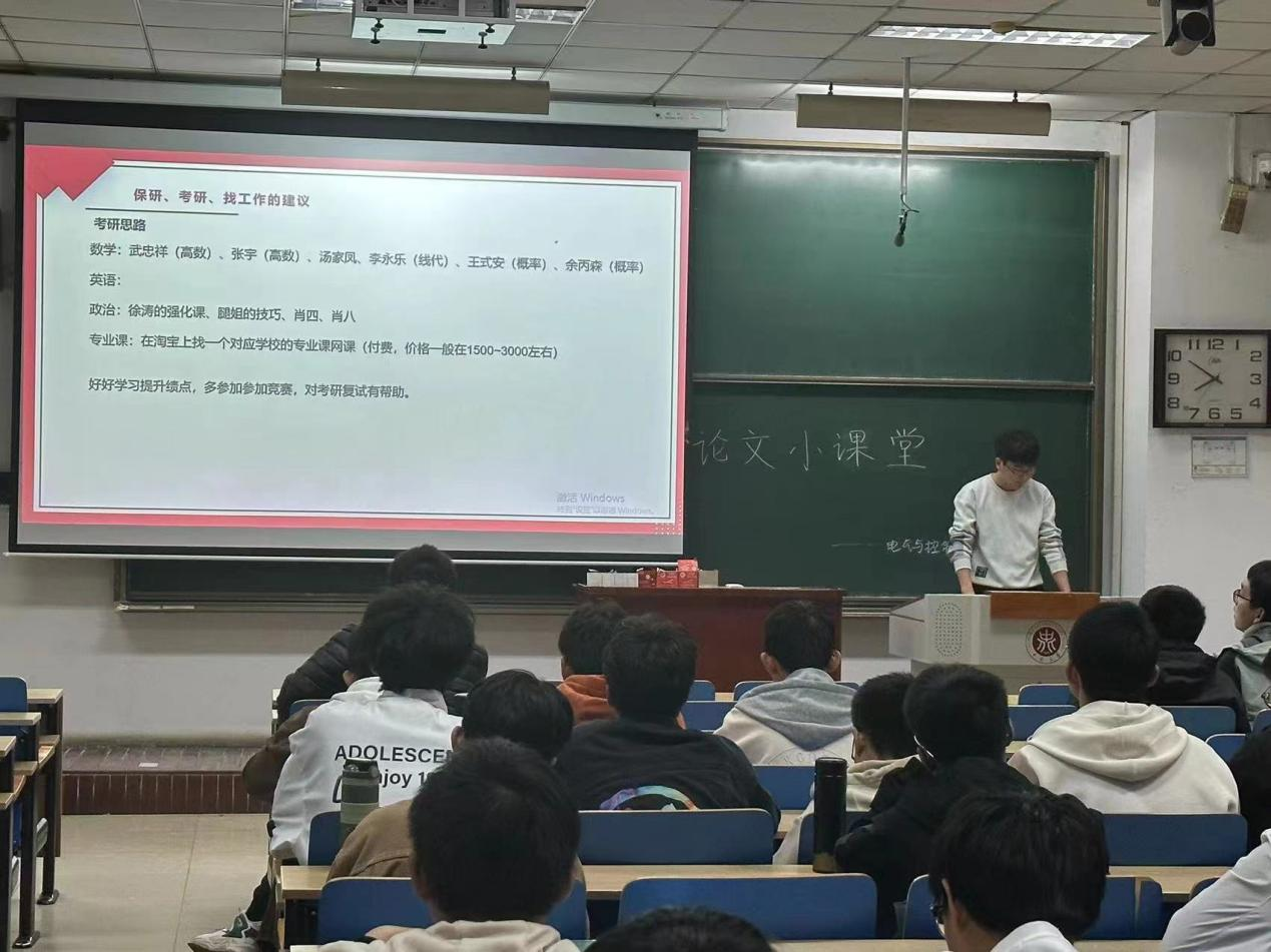 首先,李佳林同学介绍了保研的具体流程,为同学们清除保研盲区,为有意向保研的同学助力。同时李学长表示想要保研,需要有高绩点。他针对电气工程与智能控制专业所学课程,为同学们推荐了一些著名讲师。此外,他告诫同学们一定要重视学习学分高的学科,它们对学期成绩结算有很大影响力,比如高数等,这样,才有可能在学期末绩点排名中位于前列。其次,他表示想要在本专业中脱颖而出,还需要参加一些竞赛,比如数学建模,互联网+等竞赛。他给同学们介绍了一些竞赛的具体流程,难易程度,人数分配情况,报名情况等事项。同时,对有意参加竞赛的同学分享了一些成功经验。