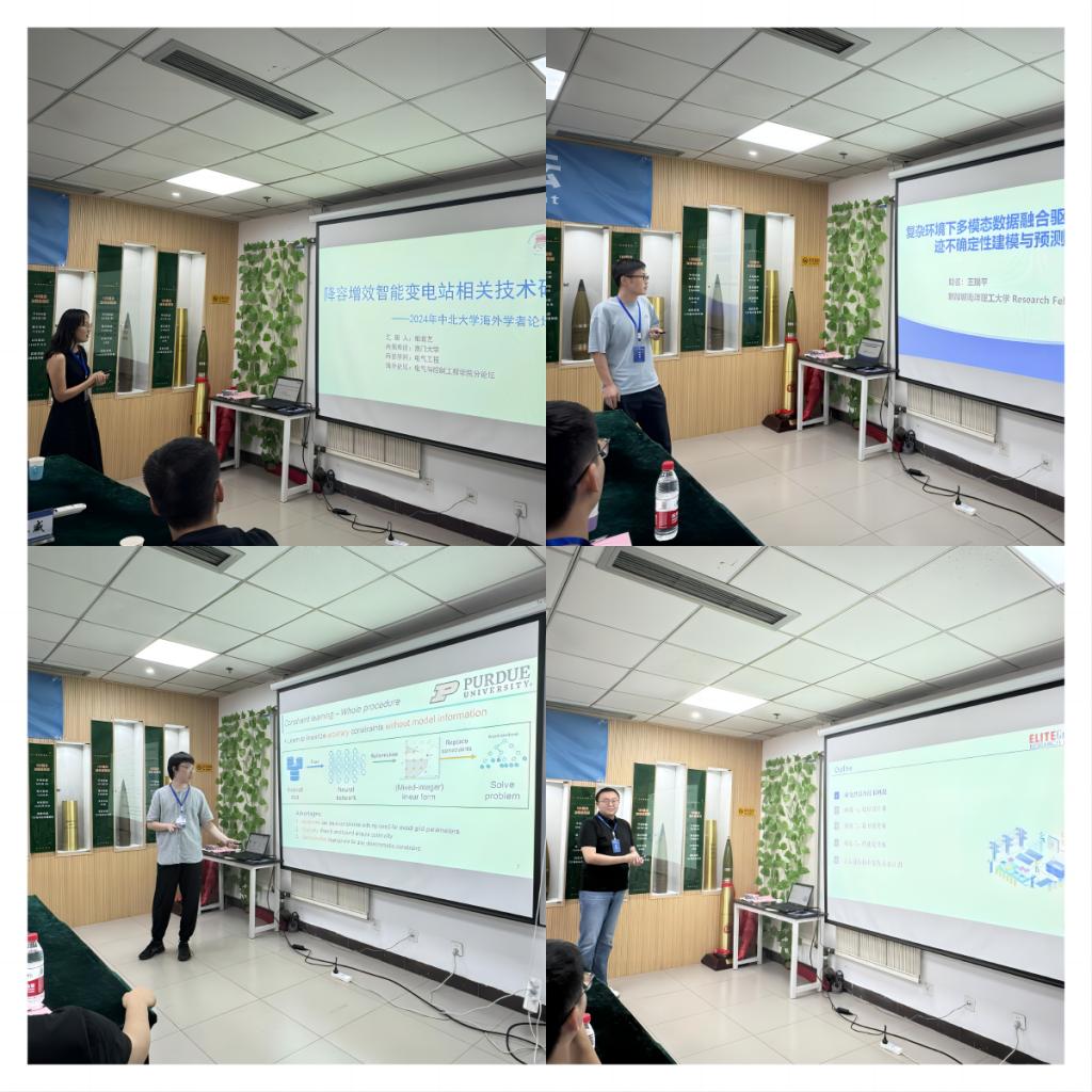 会上,副院长李晓主持了博士报告会。7名海外博士(后)介绍了毕业学校和研究方向等情况。普渡大学陈戈博士后做了关于“约束学习:一种无模型的电网调度通用线性化方法”报告,阿尔伯塔大学魏睿智博士做了关于“面向直流微网的双向电能变换与能量调控技术研究”报告,澳门大学柏滋艺博士后做了关于“降容增效智能变电站相关技术研究”报告,南洋理工大学王瑞平博士后做了关于“复杂环境下多模态数据融合驱动的行人轨迹不确定性建模与预测”报告。与会教师对报告中的内容细节进行了交流和探讨。