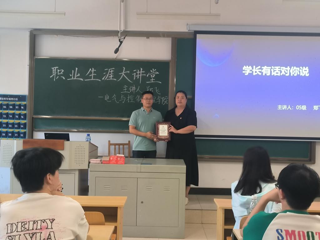 讲坛最后,学生科科长薛艳霞为郑飞学长颁发了“校友讲师”特聘证书,并讲话希望同学们能够通过学长讲解,更加了解各种企业,为自己的未来职业规划增添一份力量。