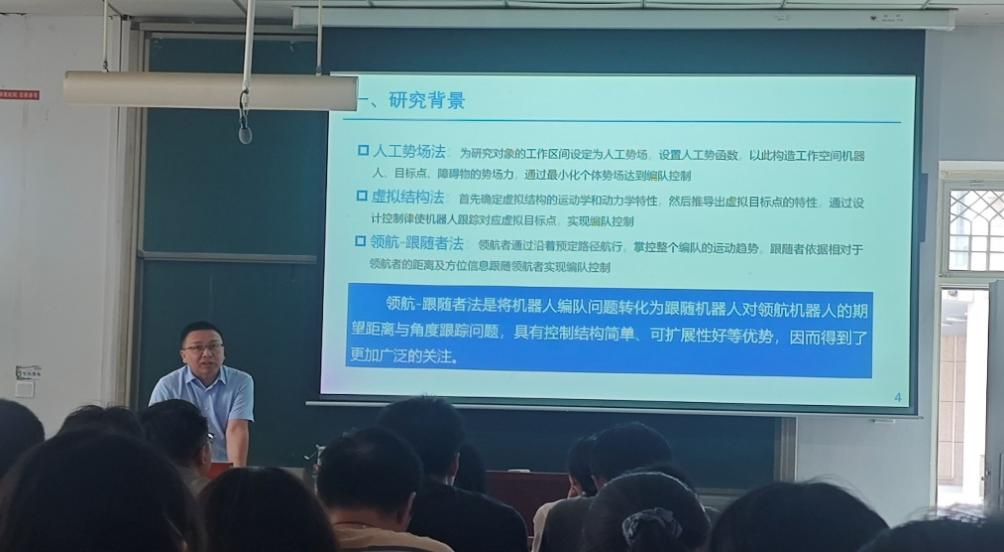 在11201T教室举办了研究生第20251503期华彩讲坛。本次讲坛邀请了太原科技大学电子信息工程学院的王健安教授,作了题为“事件触发下多移动机器人抗干扰固定时间预定性能编队”的专题讲座。讲座由学院辅导员李婷老师主持,研一学生参加。