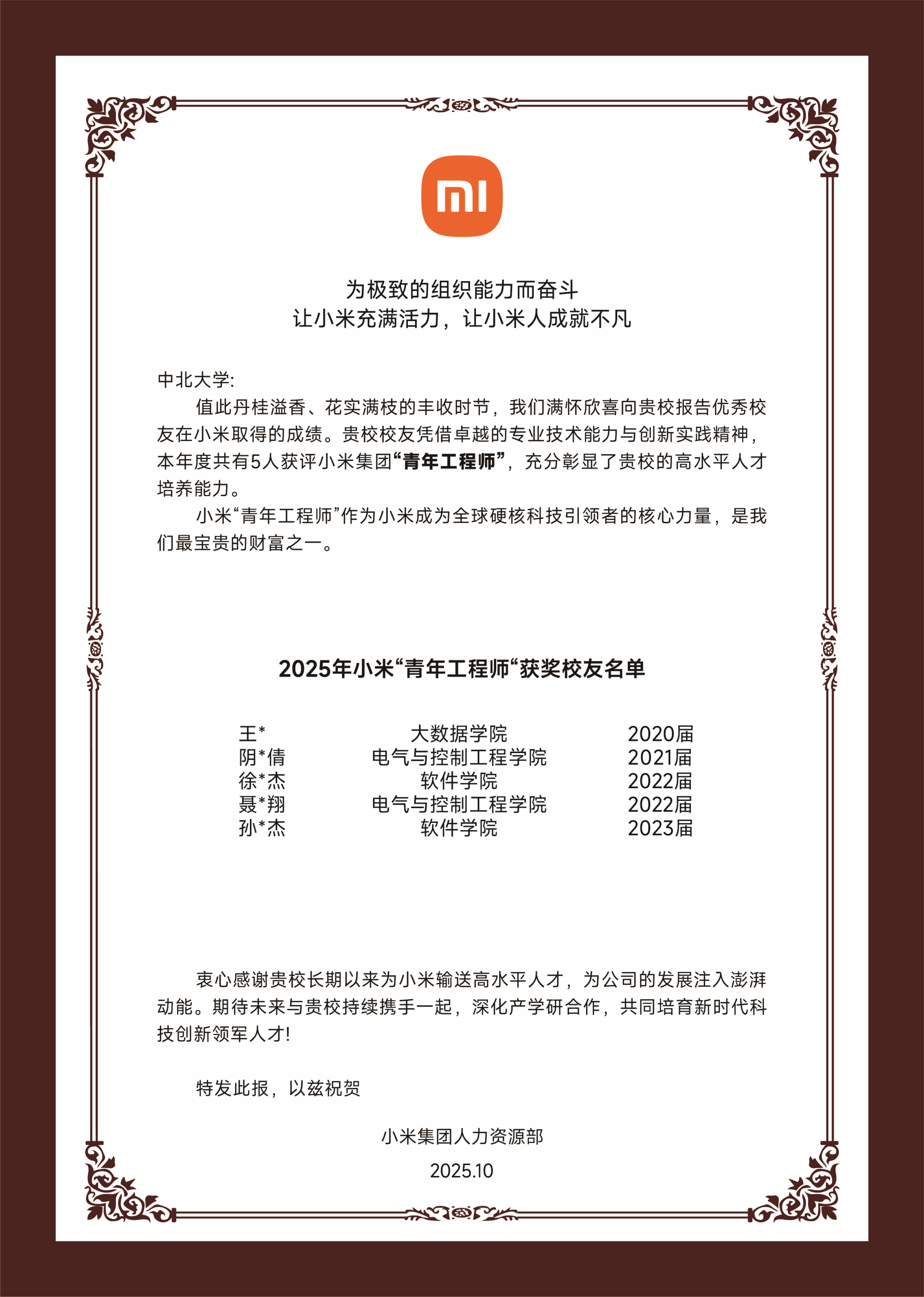 发来贺报,祝贺我校5名优秀校友在2025年度荣获小米“青年工程师”称号,其中污污漫画