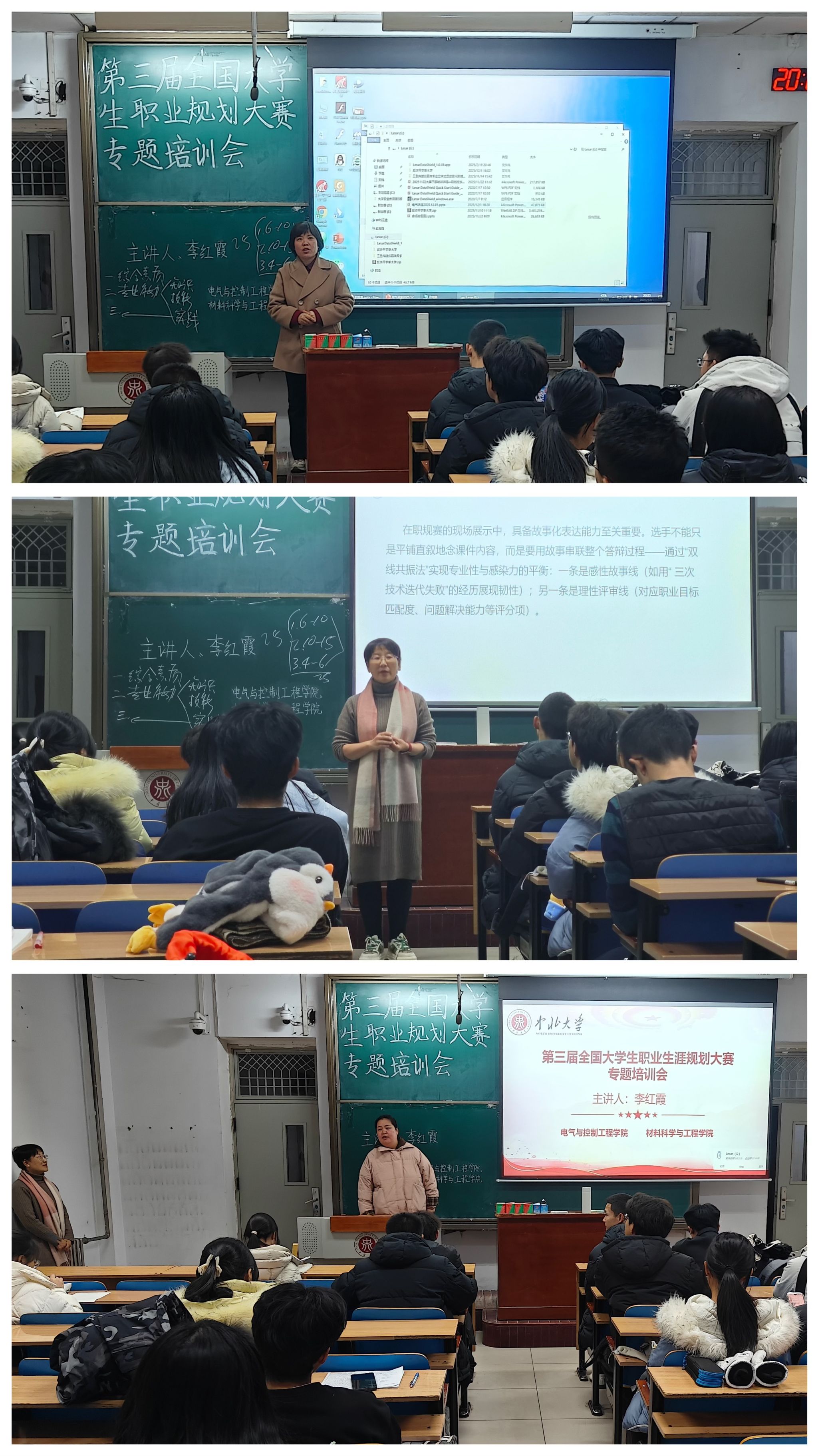 培训会上,李红霞老师讲了本次全国大学生职业规划大赛的规则、过程和职规赛“决胜三部曲”。同时,李红霞老师还对比了第二次与第三次全国大学生职业规划大赛的评审标准。