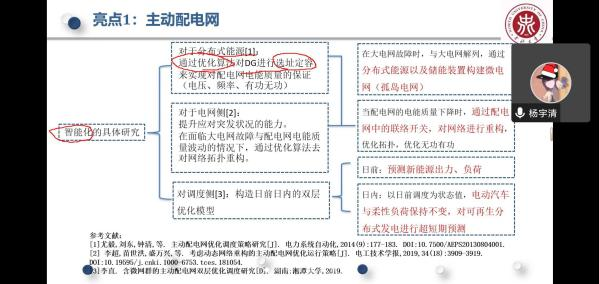 论文小学堂开始,杨宇清同学就智能电网的国内外发展引入,带同学们步入智能电网的大门。借着同学们的好奇和热情,杨宇清同学又带着大家更深入的了解智能电网的亮点,阐述了主动配电网,能源互联网,源网荷储一体化,泛在电力互联网亮点。智能电网的亮点更加燃起同学们的兴趣。乘着兴趣,杨宇清同学又指出智能电网存在的问题与挑战,帮助同学们更全面地了解智能电网。
