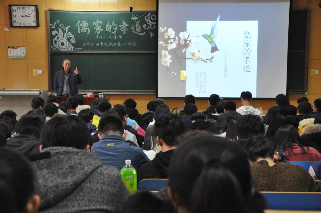 于2017年12月1日下午四点在主楼11408H教室隆重举行以“儒家的孝道”为主题的知行讲坛。本次讲坛我们有幸邀请到了中国人民大学哲学院博士、太原科技大学哲学研究所所长——毛建儒教授来为我们普及儒家的孝道。大会得到了同学们的高度重视,会场座无虚席。