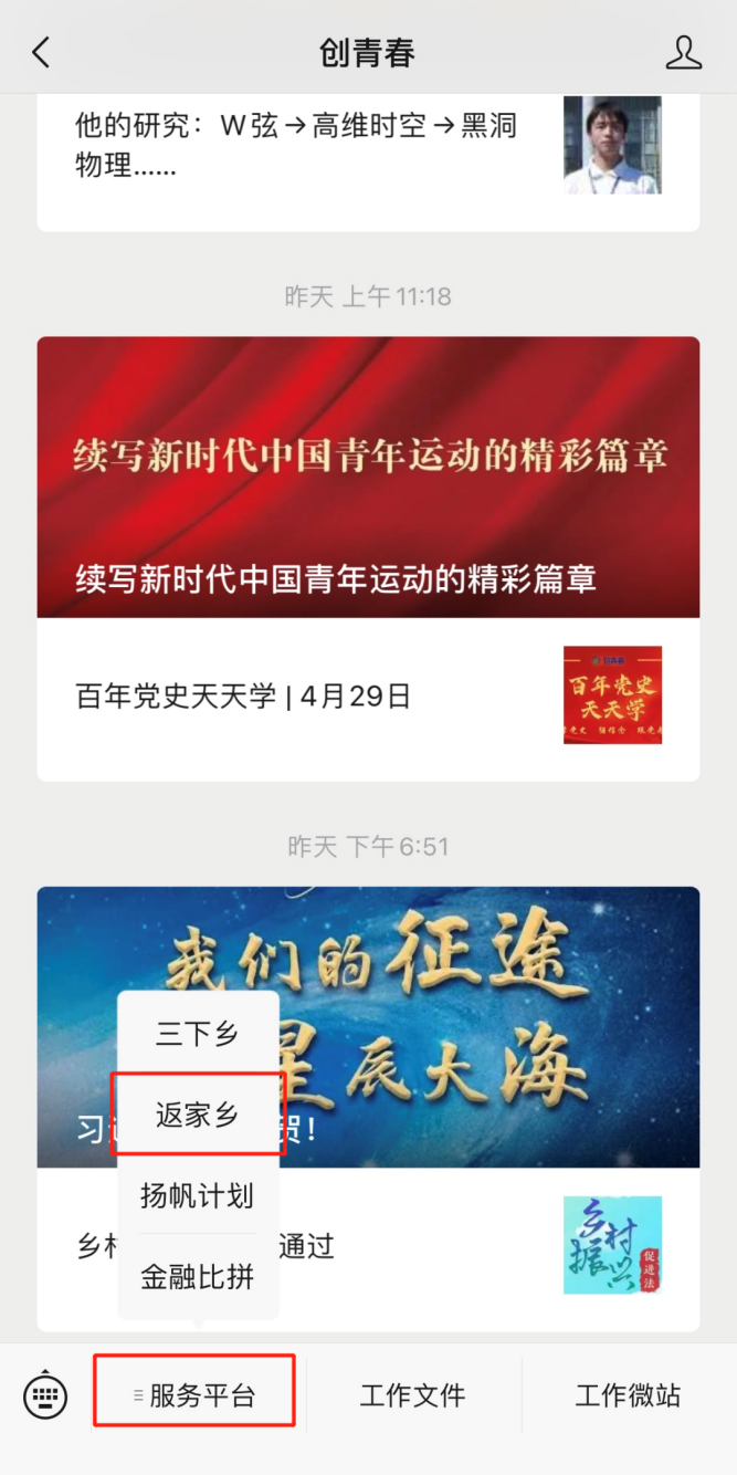 关注“创青春”公众号选择“服务平台”-“返家乡”栏目未注册的同学先进行注册注册过的同学或已有高校第二课堂成绩单系统账号的同学可直接登录具体操作教程