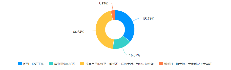 在“你上大学主要为了什么”的问卷调查中,我们得到了56份问卷,其中占比最多的是“提升自己的水平,感受不一样的生活,为独立做准备”,占比达到了44.64%。没想过的占比最低,仅为3.57%。