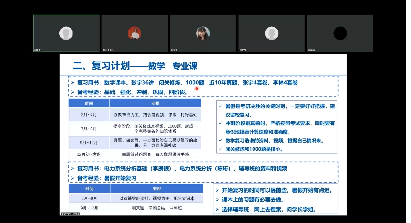 第三位发言的是高分上岸电力部黄埔院校华北电力大学的秦昊宇学长。首先他衷心地感谢了在考研初复试时给他提供帮助的学院老师们,并细致入微地描述了复习计划,让同学们在复习时有可供参考的模板,最后他提出了四点注意事项:“平衡好上课和考研之间的关系;找到适合自己的学习方法;着重注意自己的心态和作息;不盲目攀比。