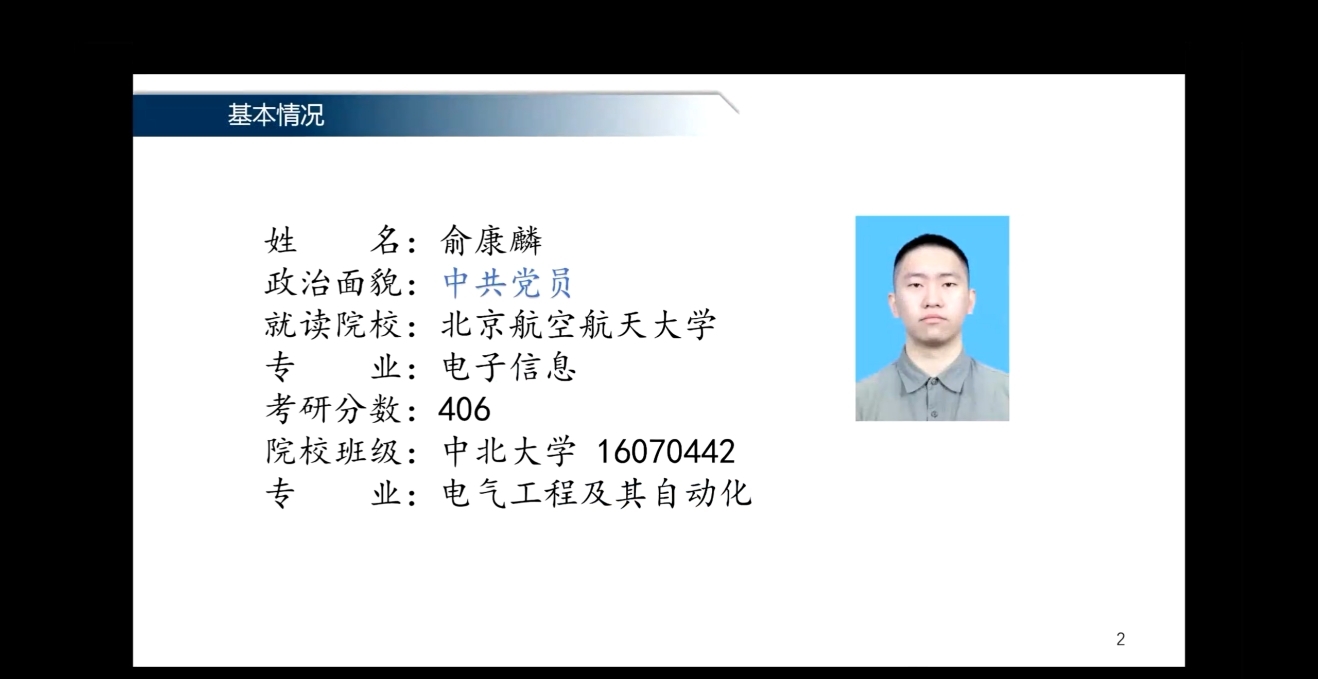 第四位发言的是电气跨考电子信息专业并以406高分上岸北京航空航天大学的俞康麟,他从学校和专业选择、专业课调研、调整作息和心态三个方面开始分享,强调了一定要转换自身的身份,进入学习模式。接着他从备战策略上建议同学们分为前期准备,中期巩固和后期加强,分而治之,终将上岸。