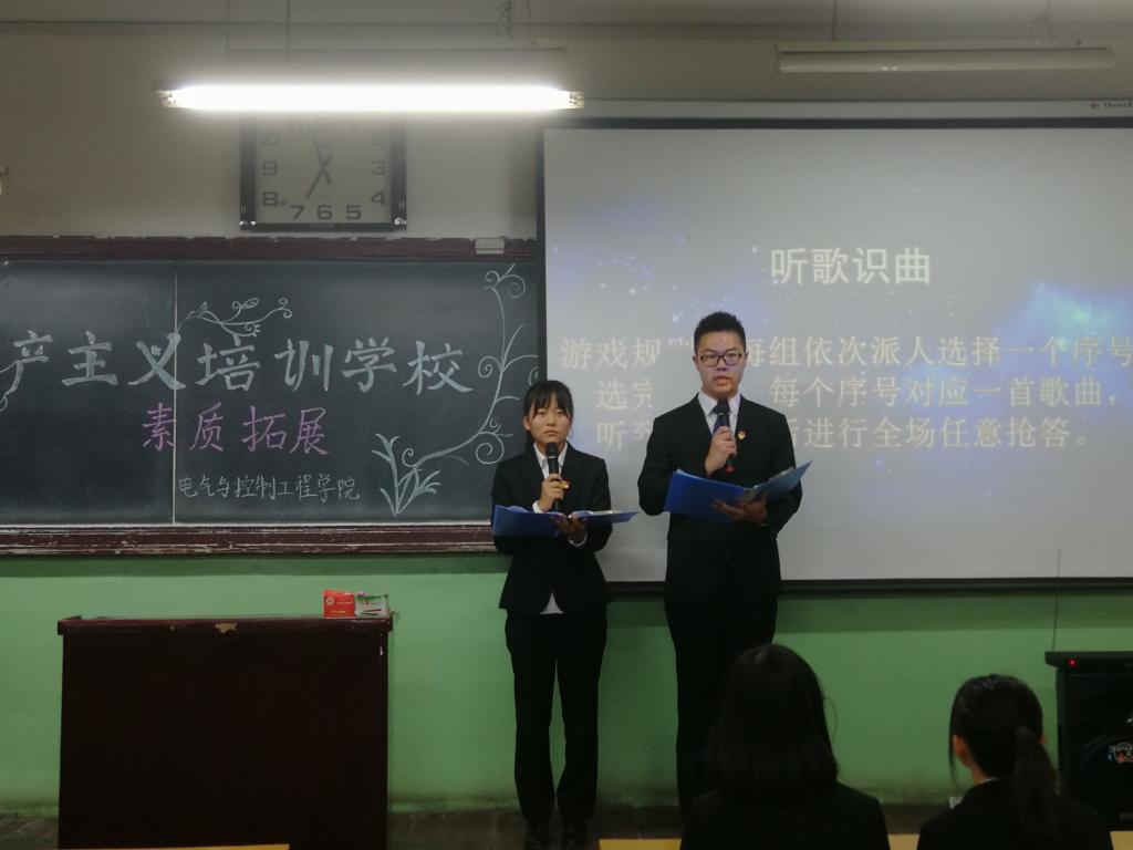 晚上19时,在01205H开展大二的室内素质拓展。首先,开始听歌识曲这个游戏。这一游戏打开大家的记忆木盒,使大家很快融入游戏之中。而紧张刺激的“你画我猜”游戏中,不仅锻炼了同学们的肢体协调能力,而且培养团队意识。在“模仿电影情节”的游戏中,同学们金句频出,打破自己的常规思维方式,大胆尝试各种电影情节。
