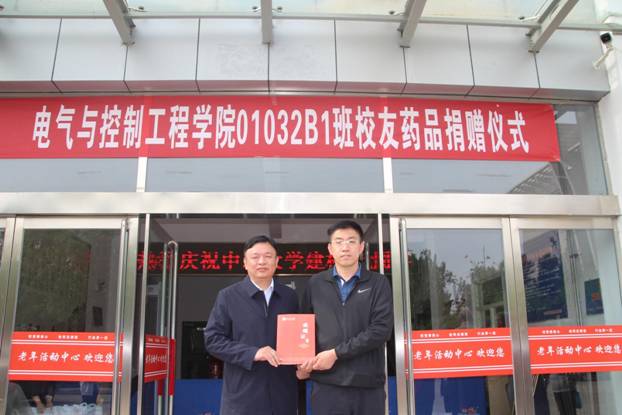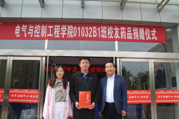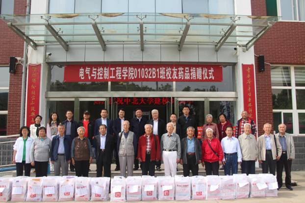01032B1班校友为母校捐赠7类疏肝理气保健药品。捐赠药品仪式在老干部处举行。01032B1班校友代表史为兴、副校长赵贵哲、山西校友会会长杨波、校友办主任张胜利、离退休人员管理处处长刘彬、污污漫画