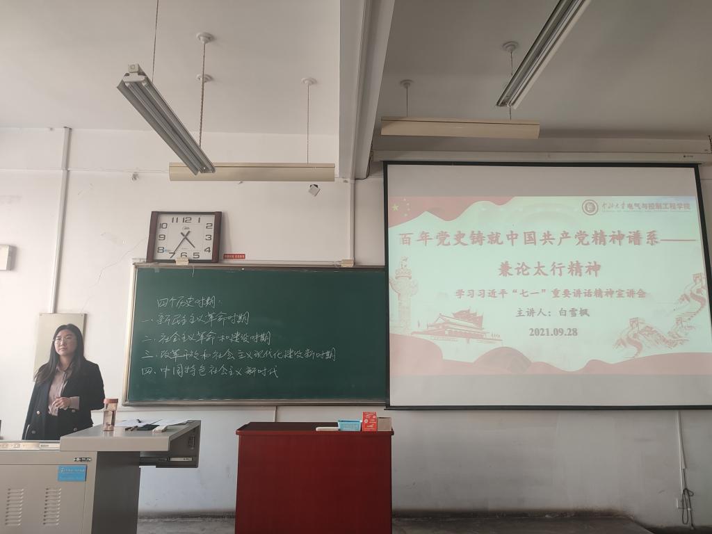 党委在14202H教室举行了学习贯彻习近平总书记“七一”重要讲话精神专题宣讲会,大会邀请到马克思主义学院白雪枫老师作了题为《百年党史铸就中国共产党精神谱系——兼论太行精神》的专题宣讲。会议由学院组织员李艳菲主持,全院200余名师生党员及入党积极分子参加了会议。