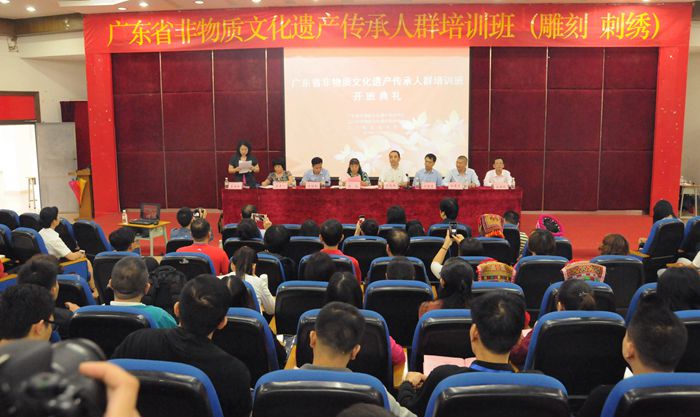11月22日上午,由广东省非物质文化遗产保护中心主办、江门市非物质文化遗产保护中心、江门职业技术学院承办的广东省非物质文化遗产传承人群培训班(雕刻、刺绣方向)在江门举行开班仪式。广东省文化厅副厅长陈杭、省文化厅非遗处、省文化馆、江门市文化广电新闻出版局、江门职业技术学院相关人员以及来自全省13个地级以上市的50名学员、江门职业技术学院相关专业的教师和同学参加了开班仪式。