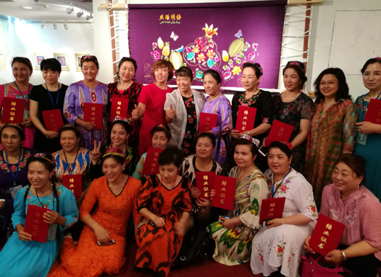 6月5日,“中国非物质文化遗产传承人群研修研习培训计划”2017年第一期新疆哈密刺绣普及培训班结业典礼在广州大学顺利举行。来自新疆哈密地区的50名绣娘传承人,历时1个月的研修研习和辛勤创作,在南国广州收获丰硕成果,作品展上绣娘们分享着丰收的喜悦,现场欢声笑语,典礼氛围热烈。据了解,该培训班是文化部、教育部联合主办的“中国非物质文化遗产研修研习计划”的一部分,旨在扩大传承人群的培训,提升传承人文化自信,拓展传承人群视野,提升传承可持续再创造能力。
