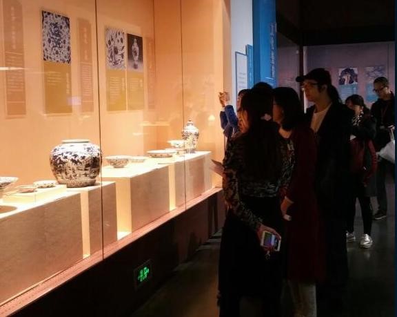 观众们欣赏素雅清丽的青花瓷