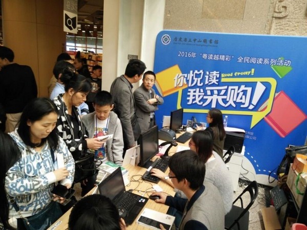"你悦读·我采购"志愿者为读者现场借阅图书