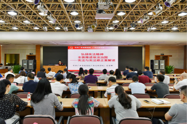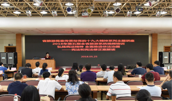 为全面贯彻党的十九大精神,以习近平新时代中国特色社会主义思想为指导,持续深入开展习近平新时代中国特色社会主义思想大学习大培训,按照《广东省旅游系统人才及局机关干部能力素质提升计划实施方案》安排,2018年5月25日上午,省旅游局在局九楼多功能厅举办了省旅游局宣传贯彻党的十九大精神系列主题讲座暨2018年第五期全省旅游系统专题视频培训。由中共广东省委党校/广东行政学院法学教研部主任、硕士生导师吴育珊副教授进行专题授课,专题学习《弘扬宪法精神 全面推进依法治国——宪法与宪法修正案解读》。
