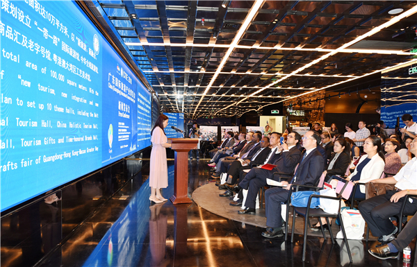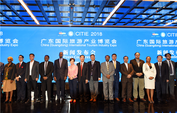7月25日,2018广东国际旅游产业博览会首场新闻发布会在珠江新城广州K11购物艺术中心言几又书店举行。广东省旅游局副局长曾晓峰、产业促进处处长东田,以及乌干达、埃塞俄比亚、葡萄牙、苏丹、波兰、柬埔寨、伊朗、巴基斯坦等22个国家驻穗总领事馆嘉宾、相关企业负责人、媒体记者合计120人参加新闻发布会。