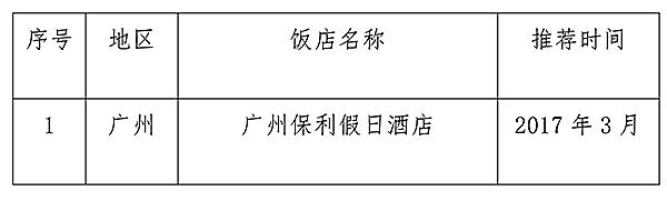 经饭店自愿申报、市级旅游星级饭店评定委员会推荐,在严格审查的基础上,广东省旅游星级饭店评定委员拟对广州保利假日酒店申请国家四星级旅游饭店进行审核。根据《<旅游饭店星级的划分与评定>(GB/T14308-2010)工作规程》,现公示如下:
