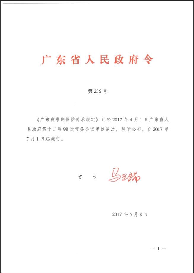 广东省人民政府令 第236号《广东省粤剧保护传承规定》