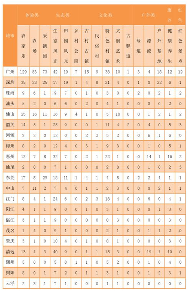 区域不平衡。目前广东各市乡村旅游的发展水平基本与经济水平呈现正相关的情况,广州、深圳、东莞、佛山等市居前,东、西、北部城市靠后,广大乡村地区乡村旅游反而发展较慢,接待人次、产品数量、消费收入三项指标,第一名与最后一名分别相差12.6、27.9、65.9倍。