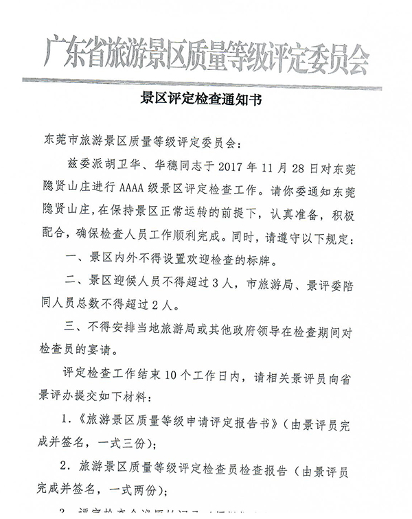 关于拟批准东莞隐贤山庄为国家AAAA级旅游景区的公示