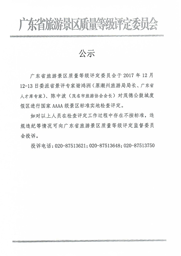广东省旅游景区质量等级评定委员会关于拟批准湛江市茂德公鼓城景区为国家AAAA级旅游景区的公示