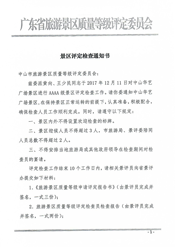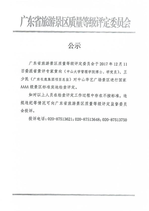 关于中山华艺广场申报国家4A级旅游景区的公示