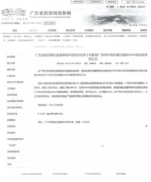 广东省旅游景区质量等级评定委员会关于拟批准广州市沙湾古镇为国家AAAA级旅游景区的公示