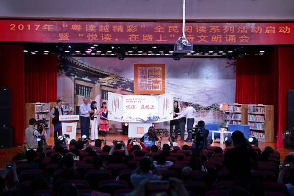 启动仪式上,珠三角地区图书馆向粤东西北少数民族、贫困地区赠送了图书,为“中华文化--2017年世界阅读日粤港澳创作比赛”获奖代表进行颁奖,举办了“悦读在路上”诗文朗诵会。朗诵会以省朗诵协会组成的专业朗诵团队为班底,以经典诗文及童话故事为载体,通过情景表演、传统木偶戏剧、诗词演唱等有声语言的情感传递,将人生路上获取读本知识的愉悦和快乐在舞台精彩呈现,引起了观众强烈的情感共鸣,获得读者一致好评。