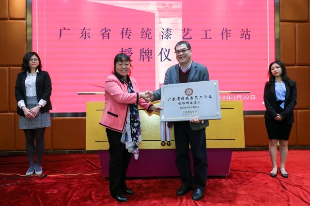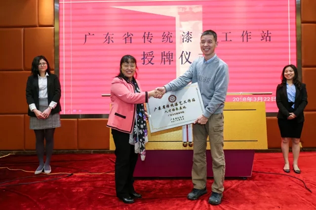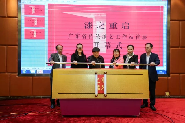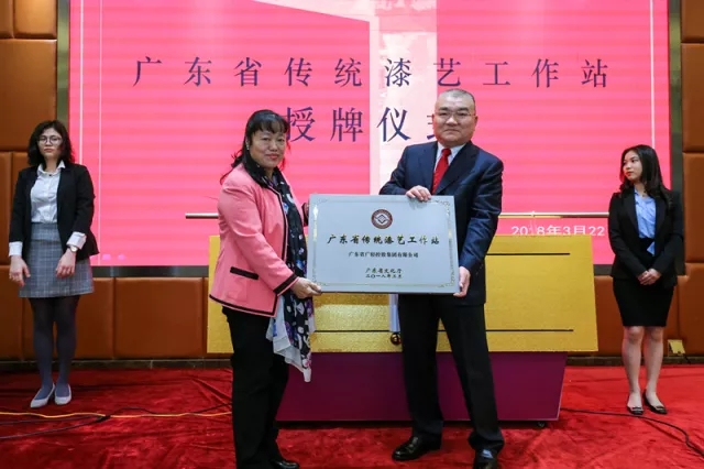 3月22日,“广东省传统漆艺工作站”授牌仪式在广东省工艺美术珍品馆隆重举行,“漆之重启——广东省传统漆艺工作站首展”开幕式、“广东漆艺的当代传承”研讨会也于同日进行。广东省广轻控股集团党委书记、董事长白涛,党委委员、总经理戴智,党委委员、副总经理花红林,广东省文化厅副厅长陈杭,广东文艺职业学院党委书记吴佳联,阳江市文广新局局长张小光,阳江漆艺院院长杨阁等多位嘉宾出席了系列活动。