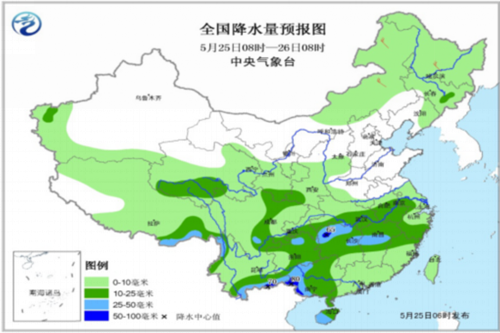 5月25日08时-26日08时全国降水量预报图。 中央气象台供图