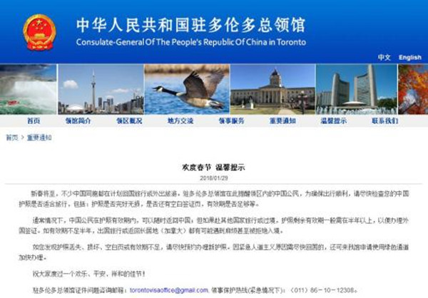 驻多伦多总领馆证件问题咨询邮箱:[email protected], 领事保护热线(紧急情况下):(011)86-10-12308。