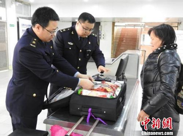 检验检疫人员在查验旅客出境行李(高明出入境检验检疫局供图 摄)