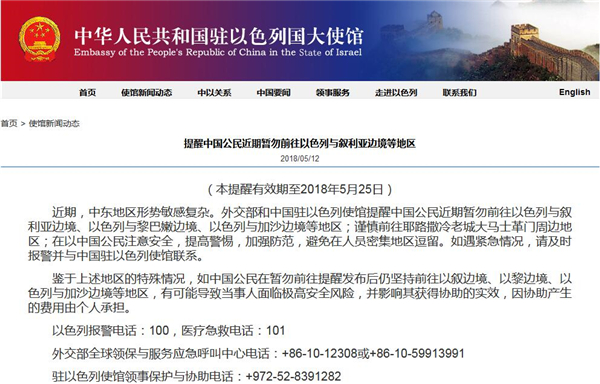 鉴于上述地区的特殊情况,如中国公民在暂勿前往提醒发布后仍坚持前往以叙边境、以黎边境、以色列与加沙边境等地区,有可能导致当事人面临极高安全风险,并影响其获得协助的实效,因协助产生的费用由个人承担。(本提醒有效期至2018年5月25日)