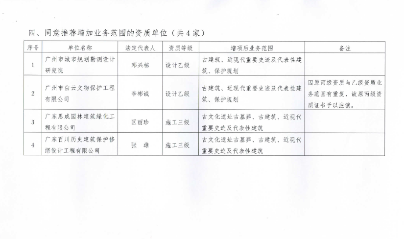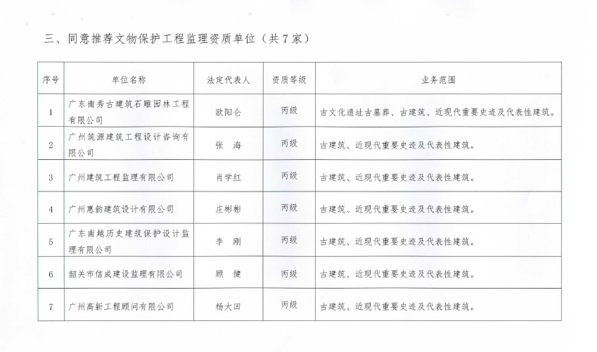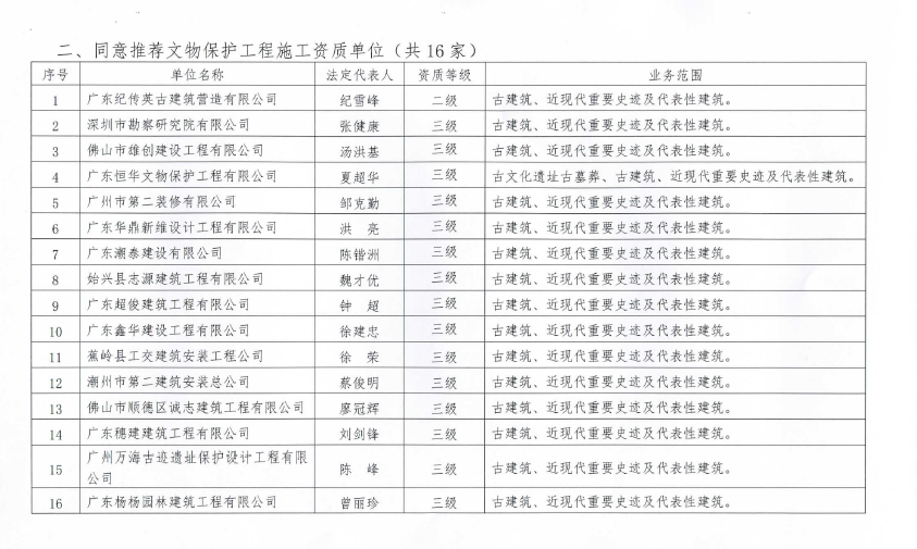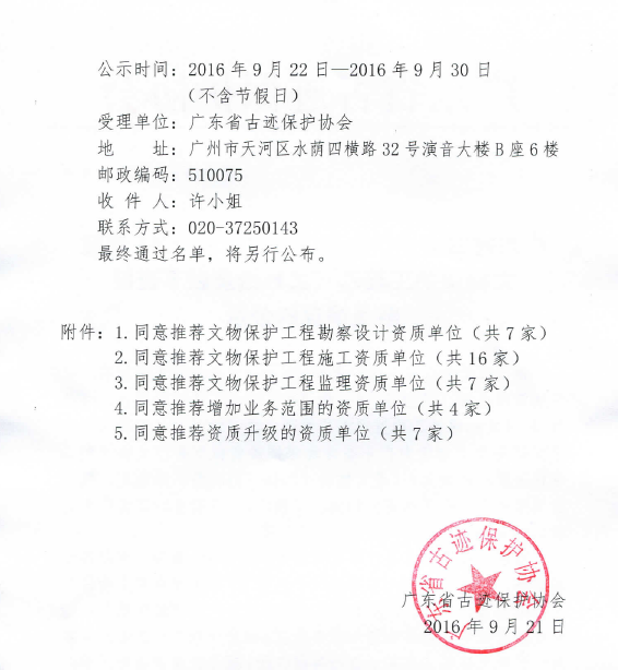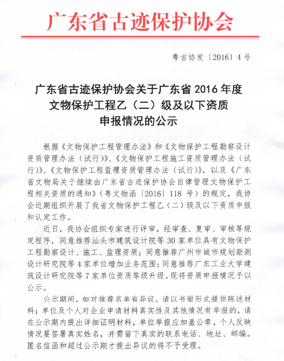 广东省古迹保护协会关于广东省2016年度文物保护工程乙(二)级及以下资质申报情况的公示