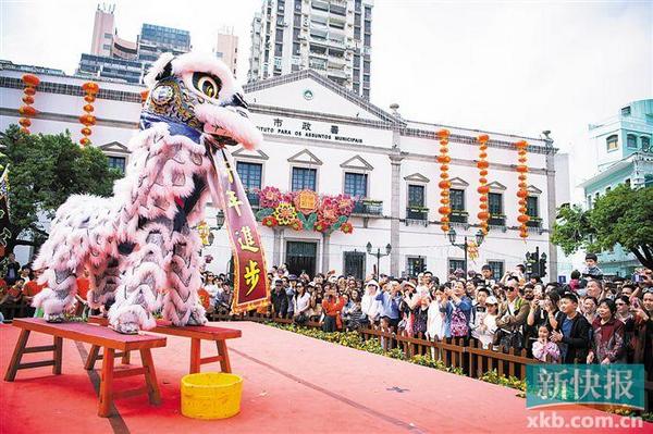 春节期间,演员在澳门议事亭前地表演舞狮。新华社发
