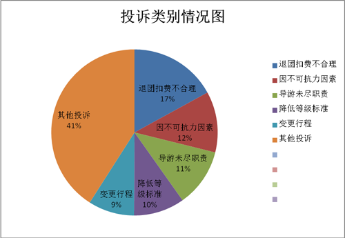 (三)出境游投诉是重点。出境游投诉主要反映游客报名被拒签后,组团社扣费不尽合理、旅行社或领队人员降低服务质量标准和延误、变更活动行程等问题。