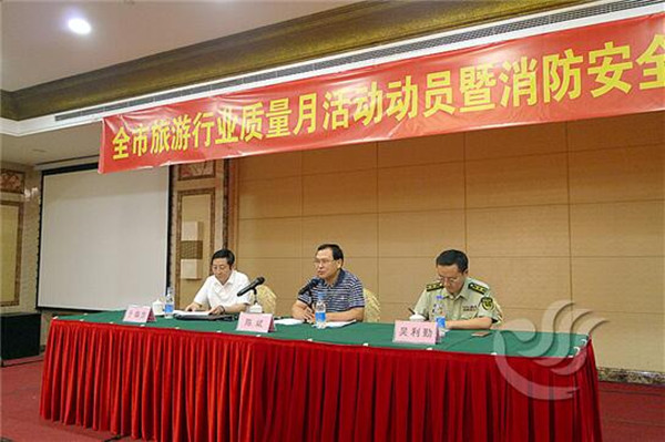 会上,于临生副局长传达了“质量月”活动有关通知精神,并集中约谈了各区县旅游主管部门、各旅游企业的消防责任人,市公安消防局的领导就旅游行业消防安全工作提出了要求,陈斌局长对本行业“质量月”活动及消防安全排查整治工作进行部署动员。会议还邀请了市公安消防局有关专家进行了消防知识培训。会后,全体与会人员现场观摩了汕头花园酒店的消防演练活动。