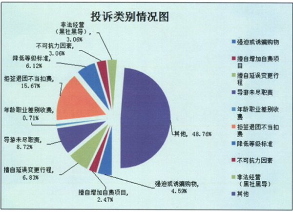 按投诉类别划分,投诉热点主要集中在:投诉旅行社拒签后退团不当扣费、导游未尽职责、擅自延误变更行程、由于不可抗力因素引起投诉、降低等级标准等问题上。其他投诉主要是签证、出境游押金、预定酒店等问题引发投诉。数据显示,投诉旅行社在游客出国旅游被拒签后,退团扣费不尽合理133宗,占全部投诉的15.67%;投诉导游未尽职责74宗,占全部投诉8.72%;因延误擅自变更行程58宗,占全部投诉的6.83%;因降低等级标准52宗,占全部投诉的6.12%,因不可抗力因素26宗,占全部投诉的3.06%,非法经营(黑社黑导)26宗,占全部投诉的3.06%,其他投诉414宗,占全部投诉48.76%。
