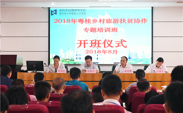 根据《广东广西旅游扶贫帮扶合作框架协议》,为落实深化化粤桂旅游扶贫协作的工作部署,拓展粤桂旅游扶贫协作平台,强化两省(区)乡村旅游人才交流,广西壮族自治区旅游发展委员会、广西壮族自治区扶贫开发领导小组办公室、广东省旅游局、广东省第二扶贫协作工作组于8月21-26日在深圳共同主办“2018年粤桂乡村旅游扶贫协作暨旅游扶贫创业致富带头人专业能力提升专题培训”。本次培训班由广西旅游人才培训中心和深圳市经理进修学院承办,广西8市33个贫困县的100名贫困村致富带头人、乡村旅游区(农家乐)负责人参加了本次培训。