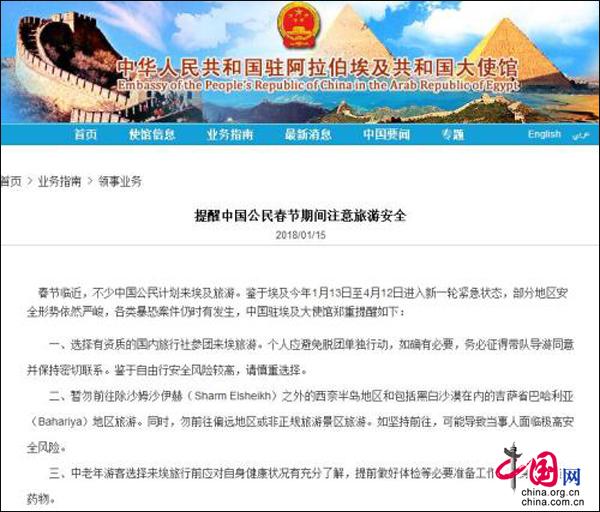 中国网116日讯 记者近日从中国驻阿拉伯埃及共和国大使馆网站获悉,在春节探亲旅游小高峰期间,不少中国公民计划赴埃及旅游。鉴于埃及于当地时间2018113日至412日进入新一轮紧急状态,部分地区安全形势依然严峻,各类暴恐案件仍时有发生,中国驻埃及大使馆郑重提醒如下: